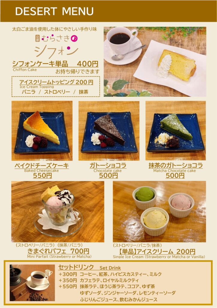 絹のようにきめ細かくやわらか太白胡麻油のみを使用し、低カロリーで健康に気づかった手作りシフォンケーキ。自然の恵みをいっぱいに受けた農家さん直送のお米、お野菜を使ったお食事でくつろぎのひとときを。